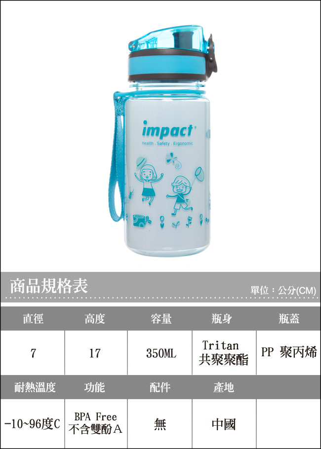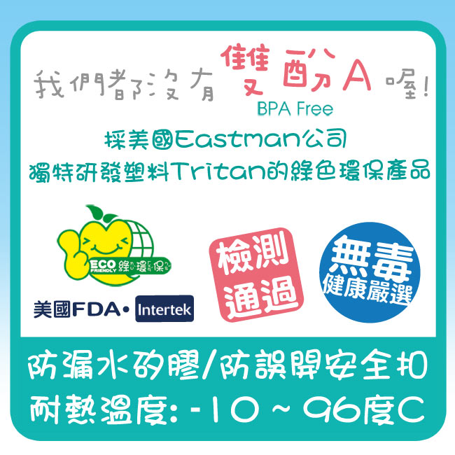 - 材質: 瓶身-Tritan 共聚聚酯 , 瓶蓋-PP 聚丙烯