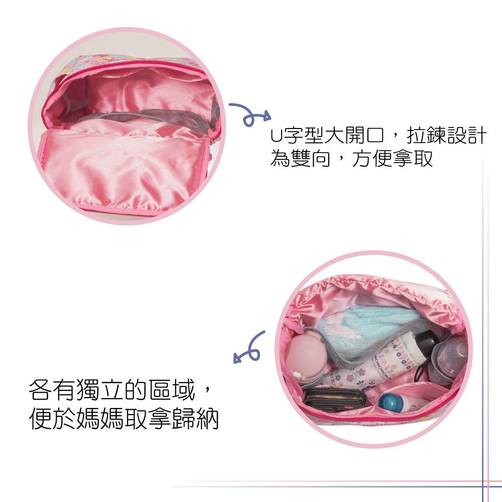- 主帶內部大容量,保溫奶水瓶、奶粉盒、尿布區,清潔用品區等獨立的區域,便於媽媽取拿歸納(下圖為示意圖)