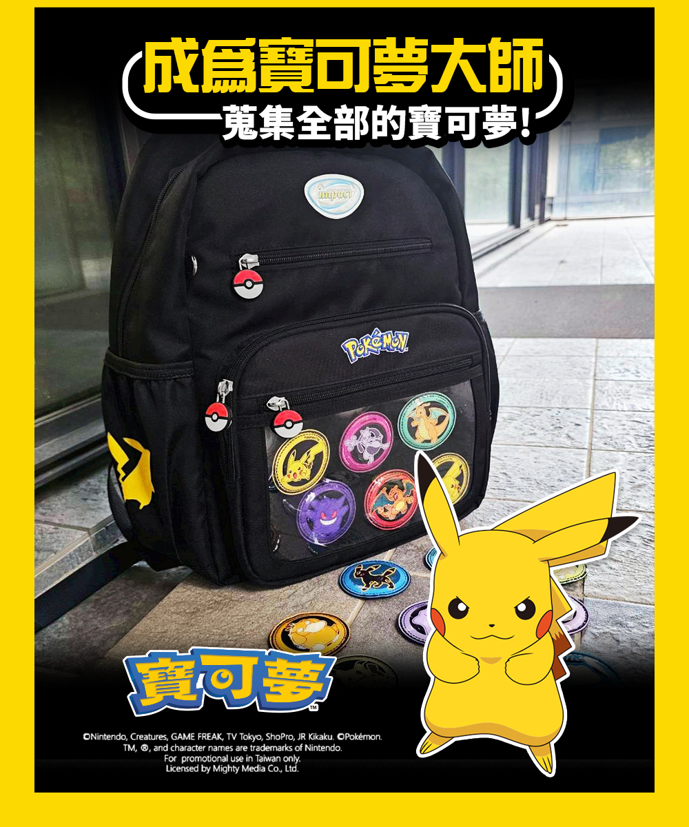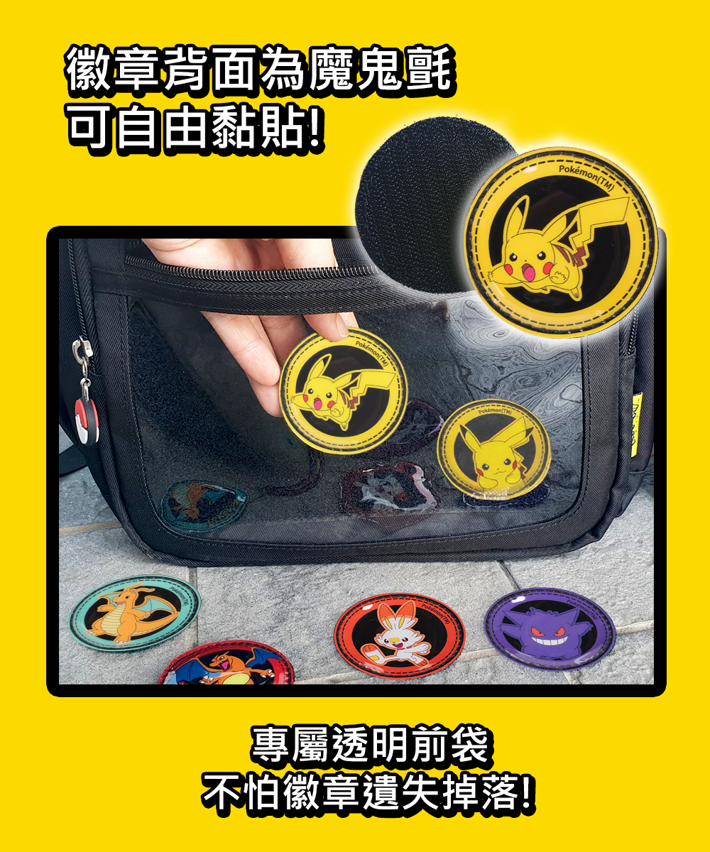 徽章可放入【IMPACT專屬寶可夢後背包】、【寶可夢側背包】的前袋透明層