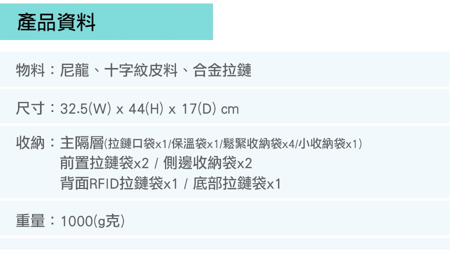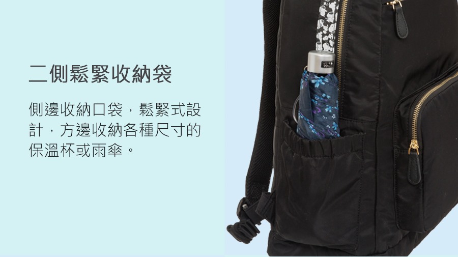 後背包多達14個口袋,包括多個分隔位及底部拉鍊袋。設有保溫袋且防滲透性佳,便於擺放冷熱飲品或輕食, 省卻額外攜帶保溫袋。