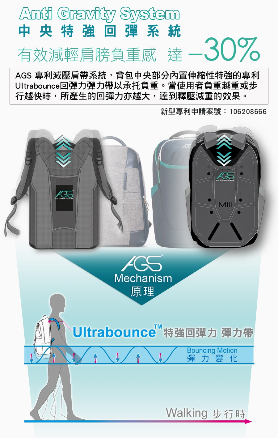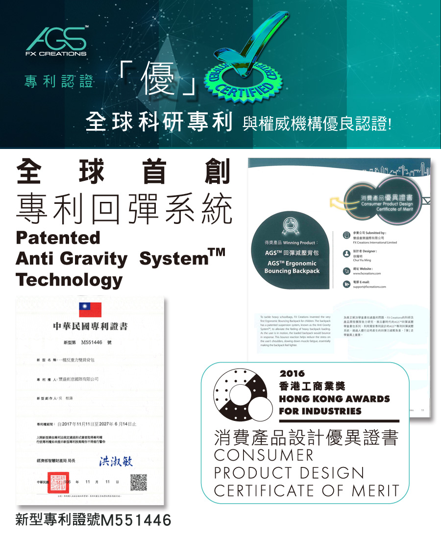 1. 獨家專利技術AGS回彈減壓系統,舒緩肩膀勞累,減輕負重感達30%。
